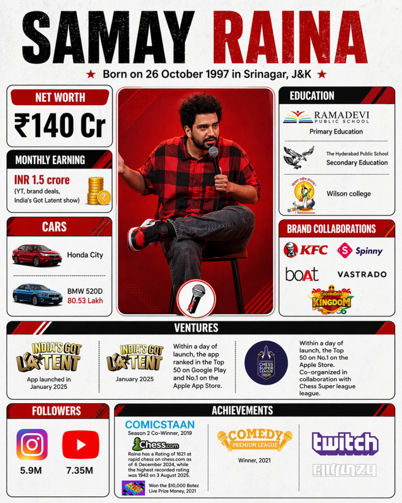 Born on 26 October 1997 in Srinagar, J&K, Samay has transformed himself into one of India’s most influential digital entertainers. Today, his estimated net worth is around ₹140 crore, with monthly earnings reportedly touching ₹1.5 crore+ through multiple income streams.